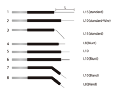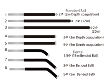 1. Электрод шар EST-G-01 (стандарт, диаметр шара 2 мм., общая длина 7 см.) 2. Электрод шар без арт. (диаметр шара 2 мм., длина 12 см.) 3. Электрод шар EST-G-06 (диаметр шара 2,2 мм., длина 20 см.) 4. Электрод шар EST-G-02 («Пуговица» диаметр 3 мм., длина 5,5 см.) 5. Электрод шар EST-G-03 («Пуговица», диаметр 5,5 мм., длина 5,5 см.) 6. Электрод шар EST-D-02 (Изогнутый, дентальный, диаметр 1,5 мм. Длина 4,5 см.) 7. Электрод шар EST-G-04 (Изогнутый, «пуговица», диаметр 3 мм, длина 5,5 см.) 8. Электрод шар EST-G-05 (Изогнутый, «пуговица», диаметр 5 мм., длина 5 мм.)